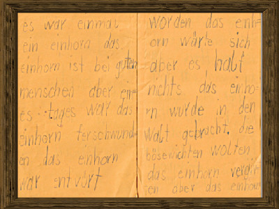 Auch wenn die folgenden vier Grundschuljahre in ihrer Dramaturgie nicht ganz mit dem ersten Tag mithalten konnten, blieb ich meinem Entschluss treu. Geschichten schrieb ich übrigens damals schon sehr gerne, wie das Bild beweist. Die (vermutlich) erste geschriebene Geschichte aus der 1./2. Klasse trägt den vielversprechenden Titel »die geschichte fom dem einhorn« und entfesselt auf zehn Seiten ein atemberaubendes Abenteuer voller Fantasie, Spannung, Action, Romantik und überraschenden Wendungen – also alles, was ein echter Bestseller braucht! (Von ein paar stilistischen Mängeln abgesehen.)